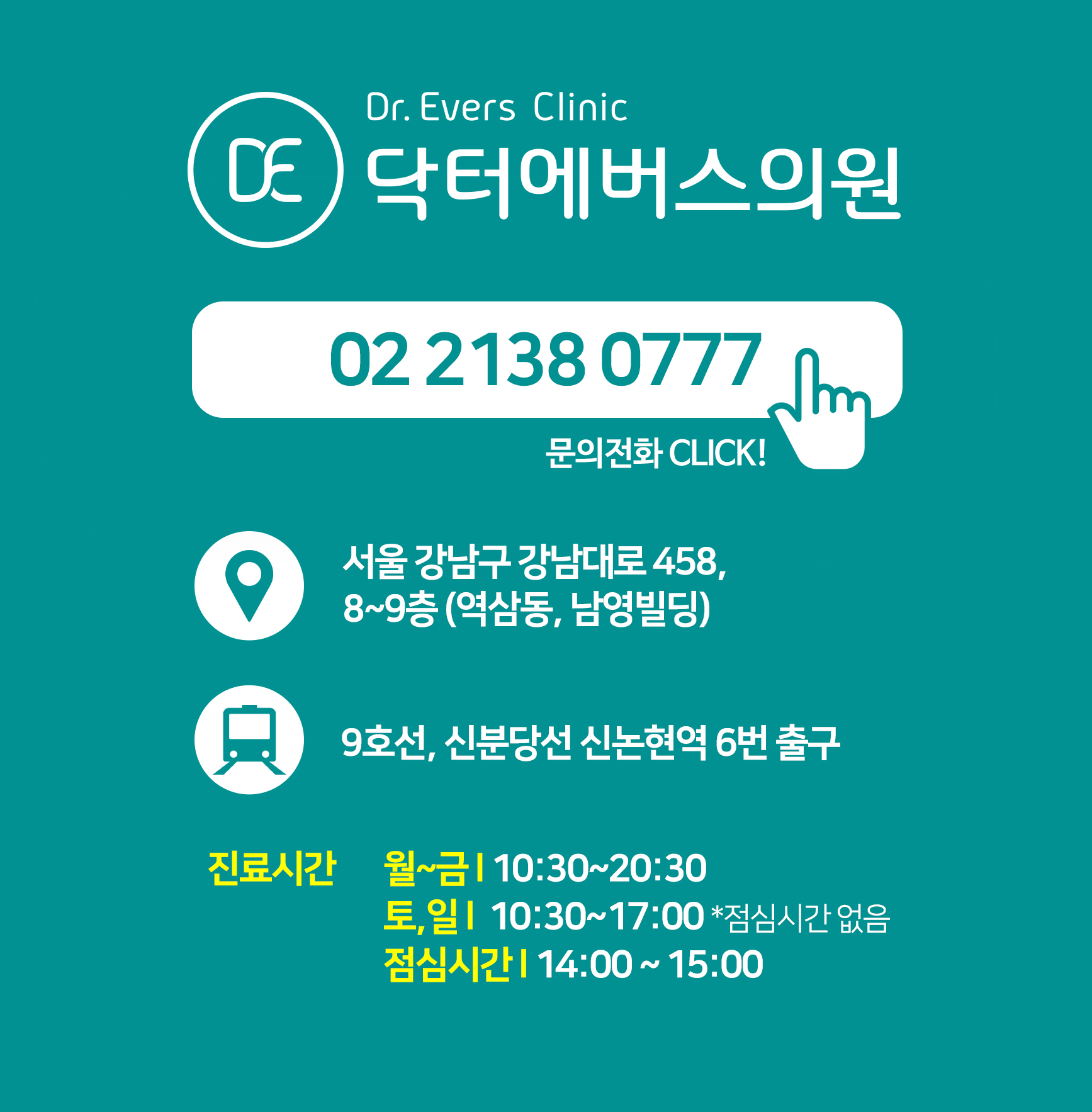 [ 진료시간 ]월~금 : 오전 10:30 - 오후 08:30토,일 : 오전 10:30 - 오후 05:00 *점심시간 오후 02:00 - 03:00*토,일 점심시간 없음